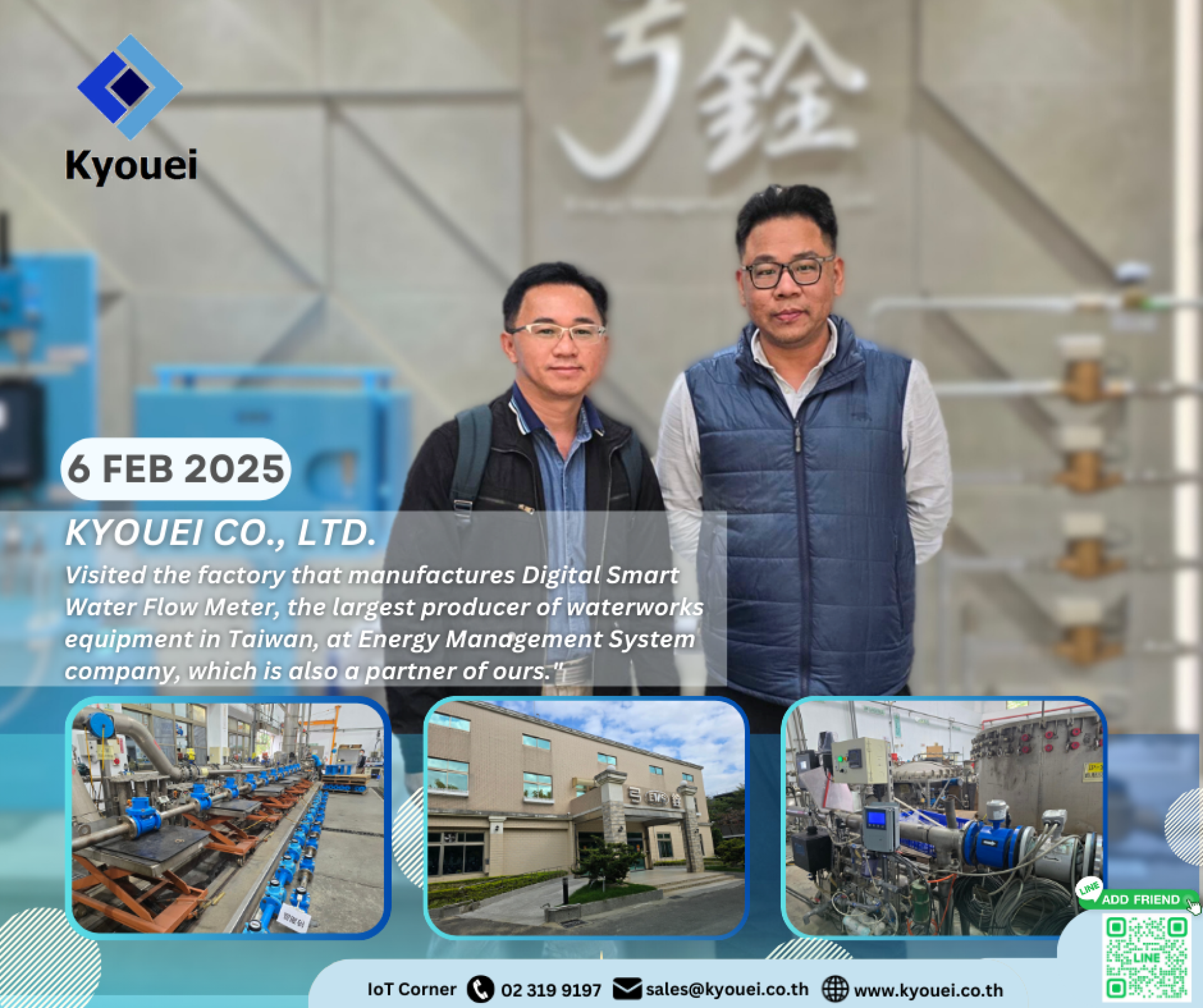 6 Feb 2025, ที่ผ่านมา คุณสุวิชา มนัสมนตรี กรรมการผู้จัดการ บริษัท เคียวเอะอิ จำกัด ได้เดินทางไปประเทศไต้หวัน เพื่อเข้าเยี่ยมชมโรงงานผลิต "Digital Smart Water Flow Meter" ที่บริษัท Energy Management System (EMS) ซึ่งเป็นผู้ผลิตรายใหญ่ที่สุดของสำหรับการประปาในประเทศไต้หวัน และยังเป็น Partner กับเราอีกด้วย