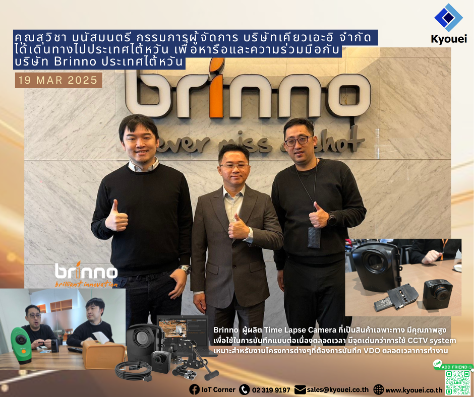 19 Mar 2025 คุณสุวิชา มนัสมนตรี กรรมการผู้จัดการ บริษัท เคียวเอะอิ จำกัด ได้เดินทางไปประเทศไต้หวัน เพื่อหารือและความร่วมมือกับบริษัท Brinno ประเทศไต้หวัน ผู้ผลิต Time Lapse Camera ที่เป็นสินค้าเฉพาะทาง ที่มีคุณภาพสูง เพื่อใช้ในการบันทึกแบบต่อเนื่องตลอดเวลา ที่มีจุดเด่นกว่าการใช้ CCTV system เหมาะสำหรับงานโครงการต่างๆที่ต้องการบันทึก VDO ตลอดเวลาการทำงาน ใช้หาสาเหตุถึงสิ่งผิดปกติต่างๆ ในครั้งนี้ได้คุยความร่วมมือทางการค้ากับ Mr.Stanley Meng (Director) และ Mr.Johnny Lin (Sales) เพื่อนำมาจำหน่ายในประเทศไทย ในลำดับต่อไป
