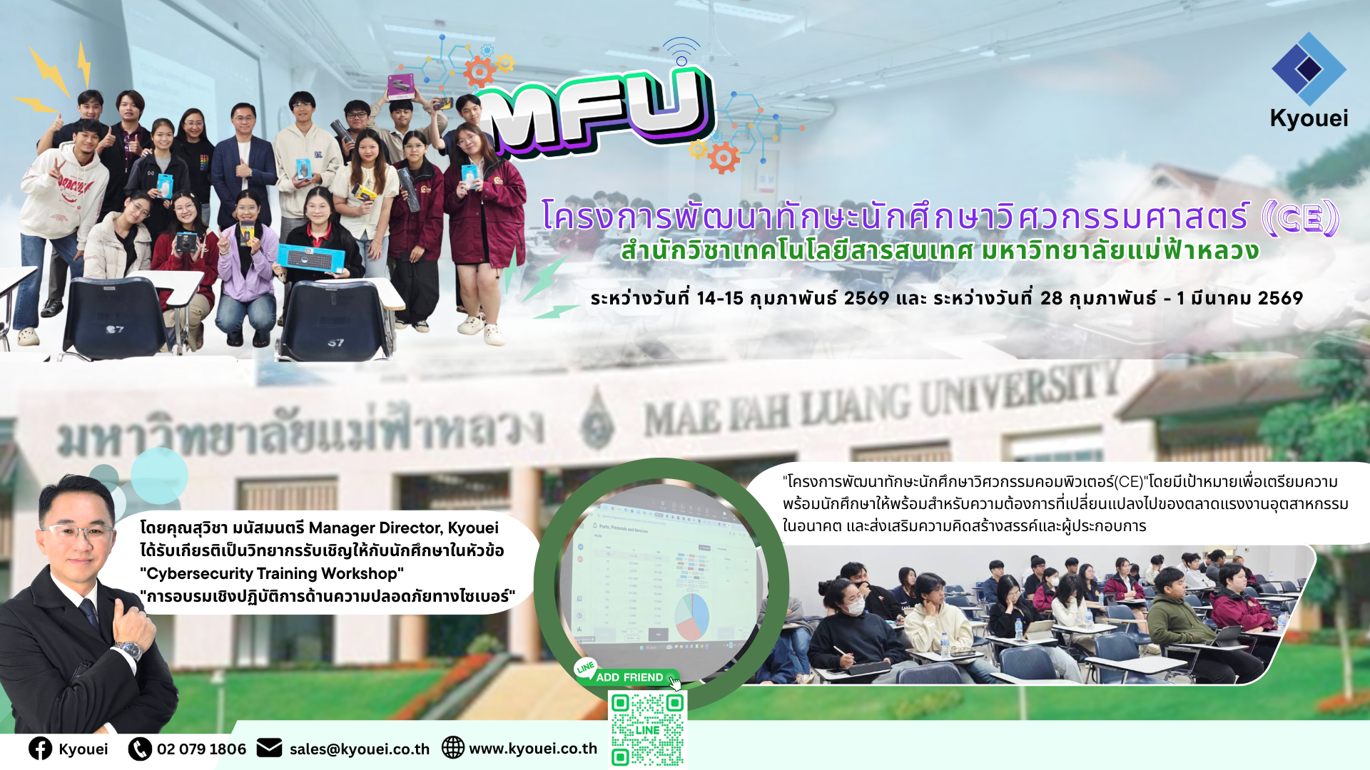 โดยบริษัท เคียวเอะอิ จำกัด ได้รับเกียรติเชิญไปบรรยาย โดยมีคุณสุวิชา มนัสมนตรี Manager Director, Kyouei เป็นวิทยากรรับเชิญให้กับนักศึกษาในหัวข้อ "การอบรมเชิงปฏิบัติการด้านความปลอดภัยทางไซเบอร์"